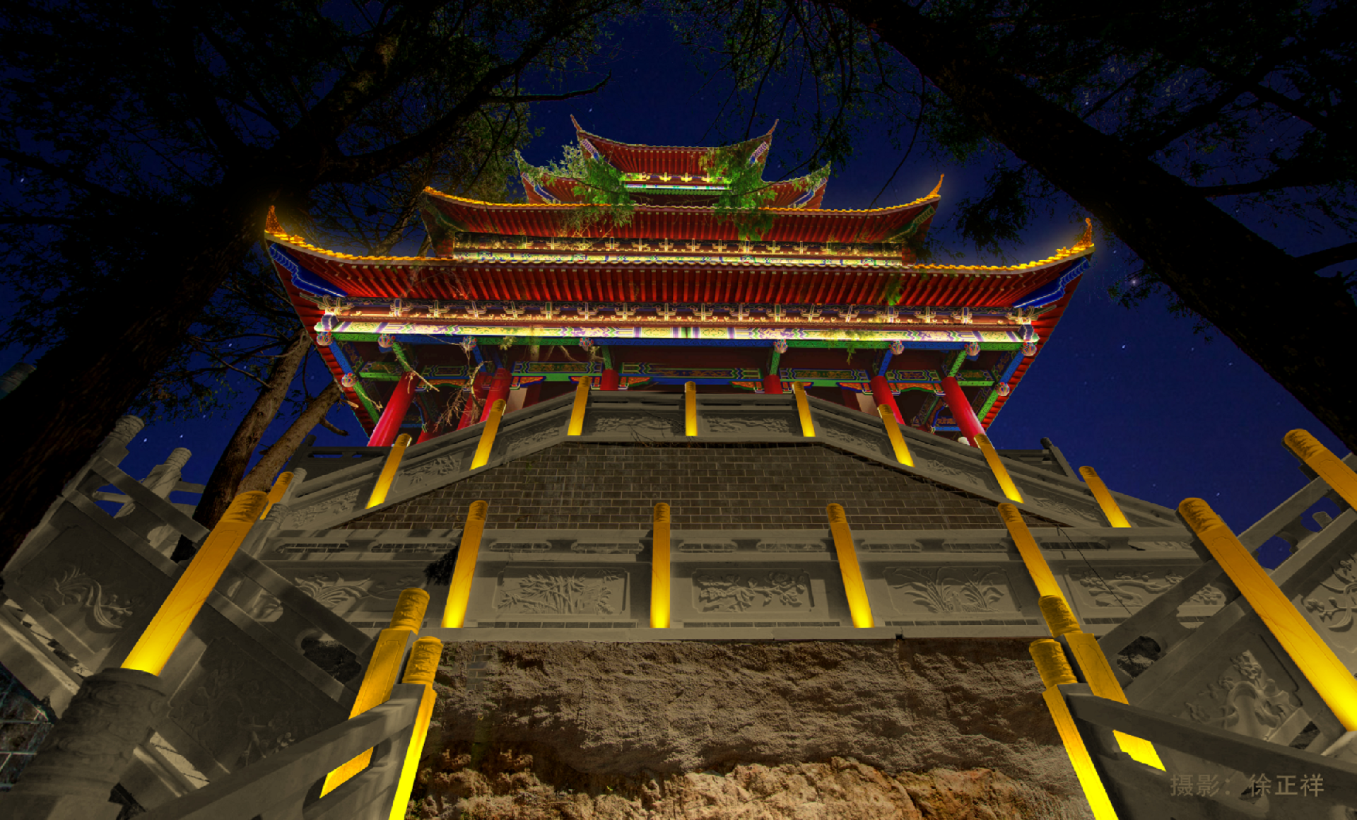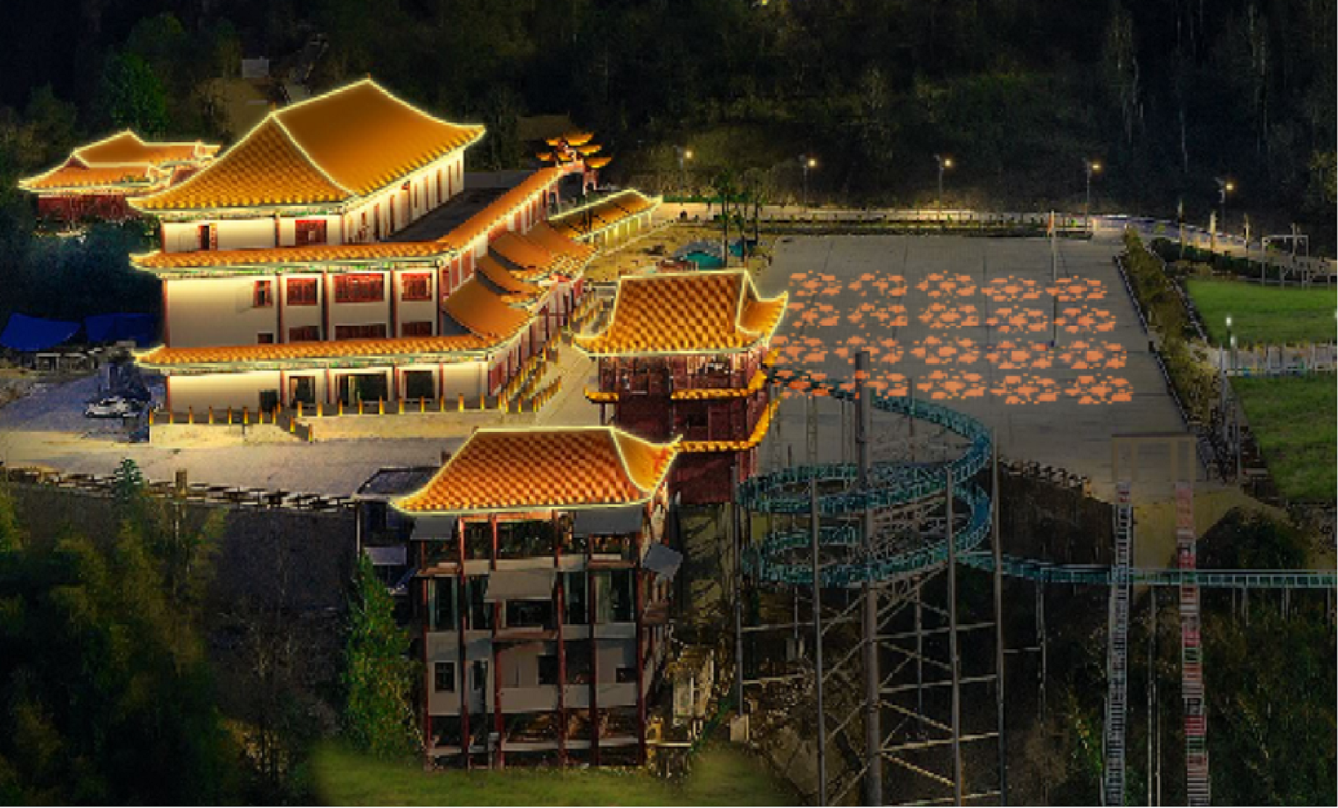 作為省內的“AAA”級景區,和景觀獨有的獨特環境,我們要表達到一種既顯得自然又突出現代繁華的氣息。所以主要設計為:建筑主要根據樓體的結構裝燈,主要采用明黃和暗金兩種色系襯托出建筑的特點,更顯佛教文化的莊嚴與肅穆,且盡量做到見光不見燈。同時采用投影燈圖案,娛樂設施亮燈,增加與游客的互動性。山林之間點綴彩色樹木,以達到山林、廟宇、游人共和諧的安寧、幽靜的效果。(在未來,當太平山景區日漸興盛,為了發展更好、更美、更優秀的燈光效果,此次設計僅為一級燈光效果設計,以后若有需要,可以在此次的設計上進行第二次設計)
